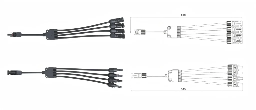 For larger systems, multi-branch MC4 connectors allow 3 or 4 strings to converge directly at the connector level and are widely used in commercial and utility-grade solar arrays.